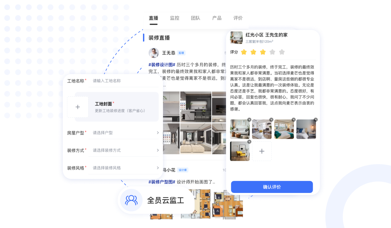 工地實時監(jiān)控直播,業(yè)主足不出戶,實時觀看裝修現場,工地圖文,視頻,VR全景實時更新,保證裝修進度。